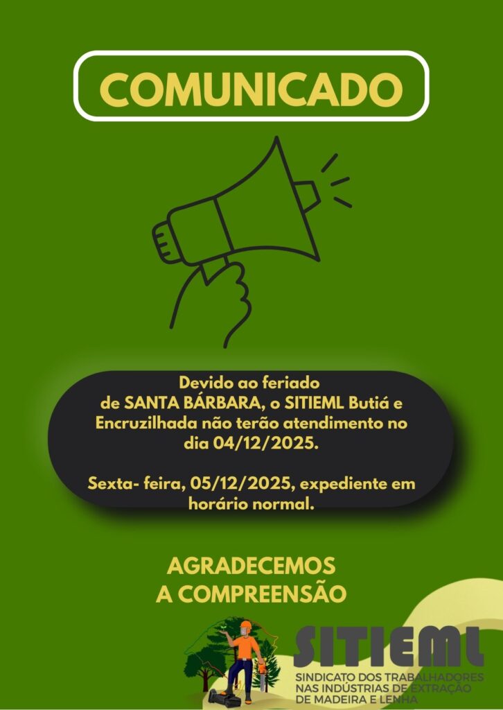 Devido ao feriado de SANTA BÁRBARA, o SITIEML Butiá e Encruzilhada não terão atendimento no dia 04/12/2025.